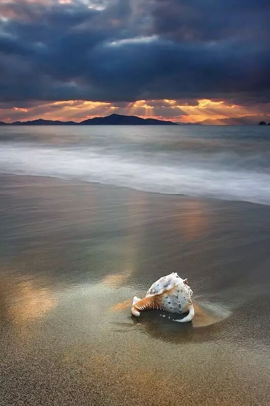 这时候大家的第一视觉落脚点应该在画面下部的海螺,但不仅限于此,你还会观察到远方的霞光,实际上,你在欣赏这张照片的时候,你分了两个步骤,拥有两个层次,而摄影师可以通过他的构图来影响你的观测顺序和观测层次,这就是所谓的构图能主动引导观众的眼球!