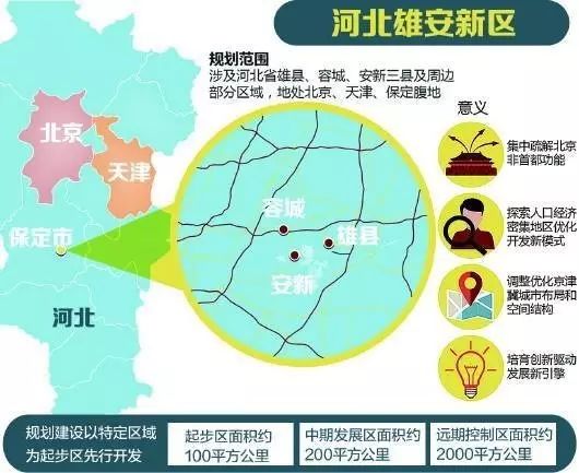 这个集中疏解区,距离北京不要太远,也不能太近,最好靠近保定,避免北京摊大饼向集中疏解区无序蔓延,最后又连为一体。从雄安新区距离保定的距离看,未来留有较大的发展空间。
