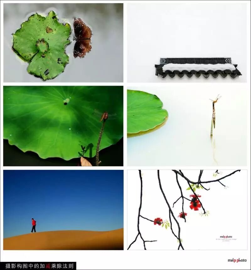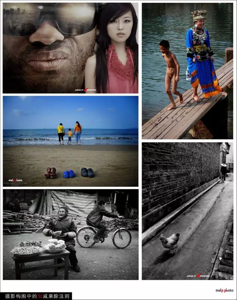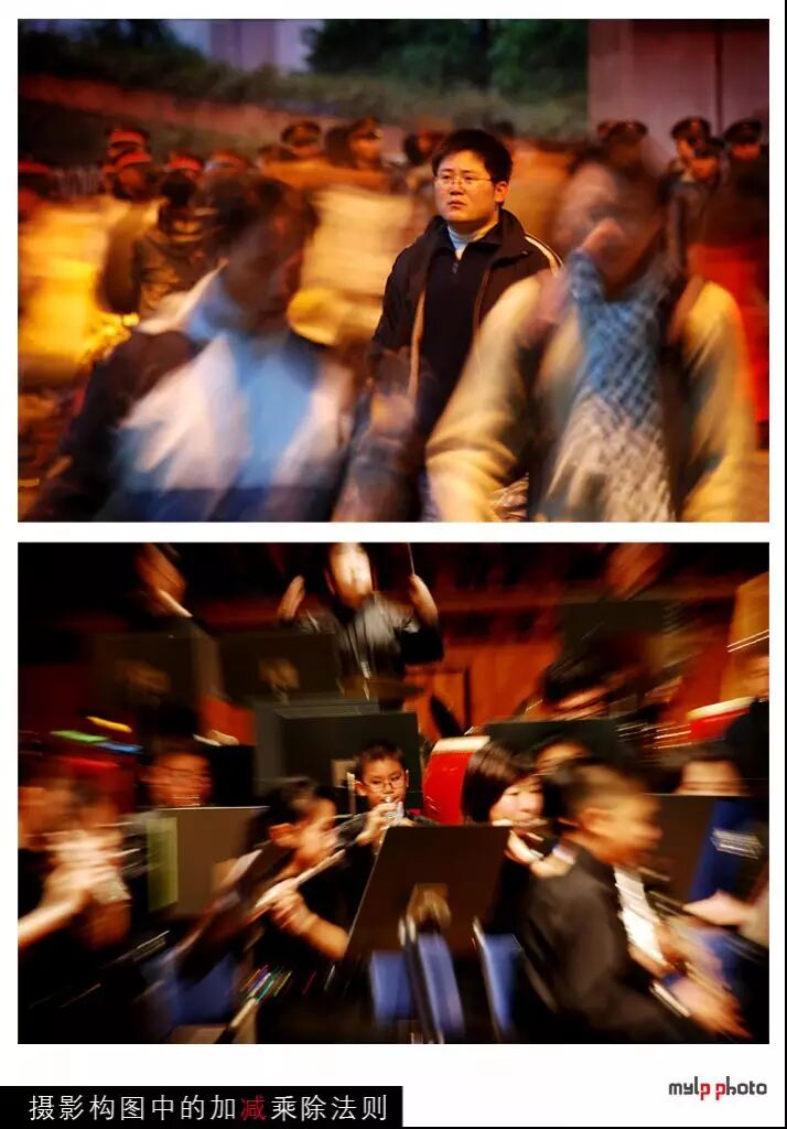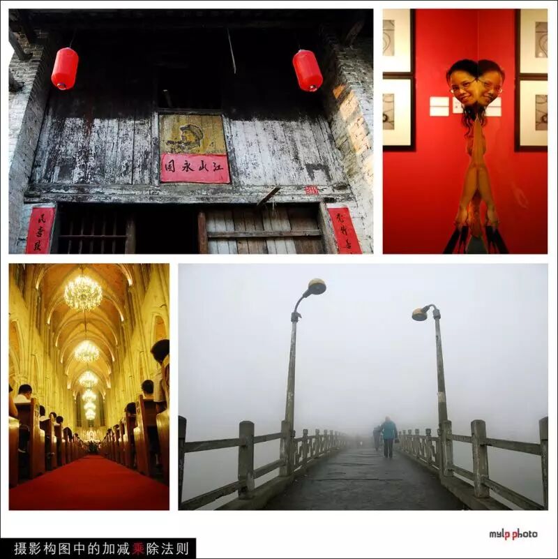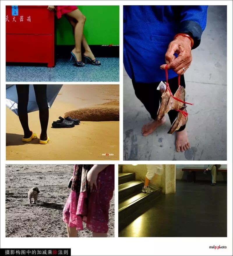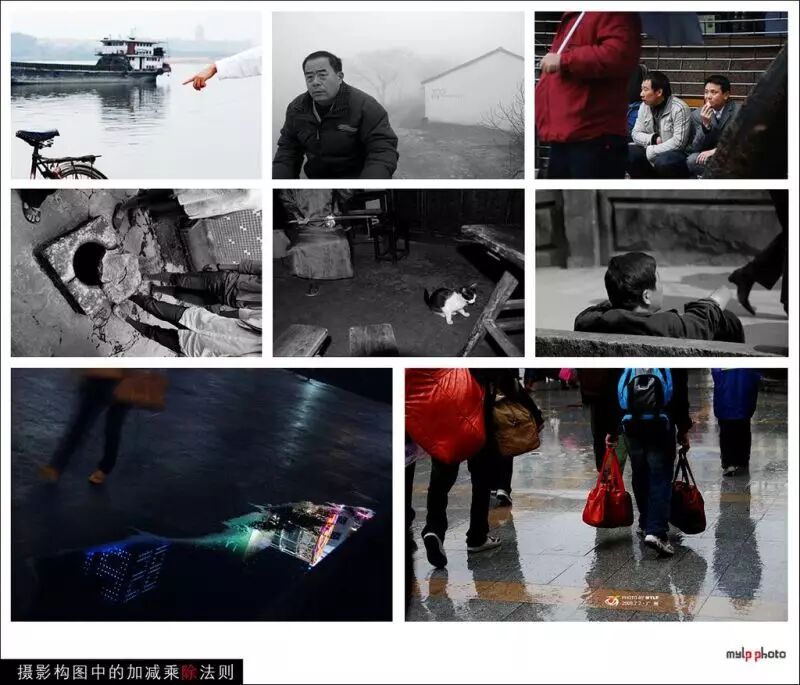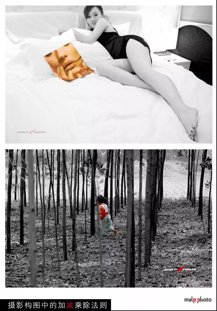 加法的应用很多很多,不能一一列举,不管怎样,务必记住一个重要的原则:要锦上添花,不可画蛇添足!加入的元素 必须为主题的表达服务,一切与主题无关或可有可无的元素,能减则减。因为,摄影总的来说就是一种减法的艺术。 方式,但如果只是不求章法的平常记录,那就不是摄影了。只有精心地提炼和艺术地再现,才是摄影的本质。很多色友 经常会这样说:俺这叫拍照不叫摄影。且不管这两个词的含义是否一样,其实说这话就是对摄影有了我以上所说的观点。 提炼就是减法,在纷繁复杂的现实世界中找到动人的瞬间,并把一切多余的元素减去,留下那最直接最迷人最精华的 部分,这样才能让人赏心悦目。我们平时在交流片子时经常会这样点评:这电线杆大煞风景啊;这个光斑太碍眼了; 把那条黑乎乎的东东去掉嘛;背景乱了点;那个人不在就好了。。。很明显,一张有着严谨构图的作品是不应该出现 让人觉得多余的元素,它应该是主体突出,主题鲜明,干净利落,一剑封喉! 含义和方式的。 简单地没有亮点没有内涵的。大家还记得爱德华·韦斯顿那只著名的甜椒吗?在单调的背景中拍一只甜椒,够简约的吧, 太平常了吧,但它绝对不简单,将一只甜椒硬生生地拍成一个活灵活现的人体,这是何等的功力! 要说到减法,说到意境,其实老外应该向咱中国画学习。大家知道,绘画和摄影是共通的,但不同的是,绘画是一种 加法的艺术,就是在一张白纸上涂鸦,西洋画祟尚写实,中国画注重写意,写意中有个很常见的手法就是——留白。 不要老是把画面堆砌得满满的,留下一些空白,留下一些联想,这也是摄影中追求意境的一种有效的手法。 高调子和低调子作品也往往是简洁的,减去复杂的背景,留下鲜明的主体。很多人物肖像题材中都会应用到。 剪影,估计也是大家很喜欢拍摄的题材。这正是一种不折不扣地减法,不管男女老少高矮胖瘦,不管善良凶恶忠奸美丑, 都会被逆光隐去真实的面目,留下的是美丽的轮廓,动人的瞬间形态。大光比的逆光下拍照,很多元素很容易过曝或 欠曝而被简化,让画面显得简洁,关键的是要捕捉到剪影的动人形态。 画框,也是一种减法,就是利用一些可穿透的前景作为一种特定的画框,将主体放在框内,简化画面,突出主体,还可以增加趣味性。 还有一种比较特殊的手法,就是运用慢门,让占比例小的静的主体实,让占比例大的动的物体虚,这样可以简化复杂的 场景,又可获得特别的视觉,比如拍流动的车灯,热闹的集市等场景;还可以运用追随或变焦手法将主体以外的背景简化。 你想去掉大街上繁杂无章的行人吗?你想去掉马路上来来往往的汽车吗?用慢门“干掉”他们 有一种可以通过后期来实现的特殊手法,就是减去颜色。将某些有视觉亮点的颜色保留,将其余部分颜色去掉,会起到新鲜的视觉效果。 利用一些特殊的天气,比如雾天、雨天、雪天等,通常会简化背景,营造出意境。所以,当遇到这些天气时,别抱怨, 赶紧抓起相机跑出去! 要想画面简洁,与拍摄距离及焦段也有关系。很多人说超广角难控制,其实就是容易摄入过多的元素,让画面杂乱,有时 避无可避那也实在没办法。用长焦可以压缩像场,减少背景干扰。拍特写当然更容易简化画面,一些动人的特写瞬间会 让人赏心悦目。更加极端的是微距,近距离就可以将主体放大,轻易减掉繁乱的背景。 【构图中的乘法】 乘法,是指相同或相近的元素在画面上大面积复制出现,或规则或不规则分布,令画面充满韵律节奏感和视觉冲击。 比较容易刺激眼球。 在构图时,变换角度去拍摄可以获得不同的视觉效果。元素的排列可以是平面的,也可以是斜向或纵向的,这样能产生 强烈的透视感和空间感。 不过,如果只是单纯的元素排列也许会单调一点,缺乏视觉亮点,如果在乘法中运用了加法,为画面增加一个趣味中心,那就更生动有趣了。在美学的平面构成原理中有个名词叫做突变,突变就是在乘法中融入的加法,打破重复与规律,产生对比,增强视觉效果。有两种情况,一种是突变的是不同的元素,一种是同一类元素自身的突变。 对称式构图也是一种乘法,因为它也是同一元素的复制,或左右或上下或斜面呈镜像分布。大家都有共识,一般情况下主体不适宜放在画面中间,普遍认为放在黄金分割点位置会比较舒服(如同三分法构图),但对于对称式构图就不用考虑这个原则,它正好需要从中间开始作对开式构图。呈对称分布的景物,对称式设计的建筑,或利用镜子、水面等反光物都可以运用到对称式构图。如果打算运用这种方式,,让画面元素平均分布,一刀两断,各不相欠! 【构图中的除法】 除法,在这里要说的是关于封闭式及开放式这两种构图观念。大家知道,数学的除法中,有的可以除尽,哪怕是有余数,最终还是除得尽,比如10÷2=5,10÷4=2.5;有的却除不尽,比如10÷3=3.333333……我就用这个法则来比喻构图中的除法,除得尽的指封闭式构图,除不尽的就指开放式构图。 下面的一组,大家看到的都是些“残肢断腿”,传统的观念常常会告诫我们,拍人要拍全,不要随便砍头切脚,但是开放式不管这些,关键看你怎么砍了,哈。。。 有一种情况,画面展现的信息是相对完整的,但由于主体的某些动作或眼神是指向画外的,与画外产生了某种关联,而其动作或眼神的含义在画内没有让人明确的解读,我个人觉得这样可以看成封闭式,可以说是开放式也无妨