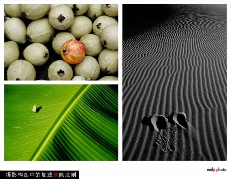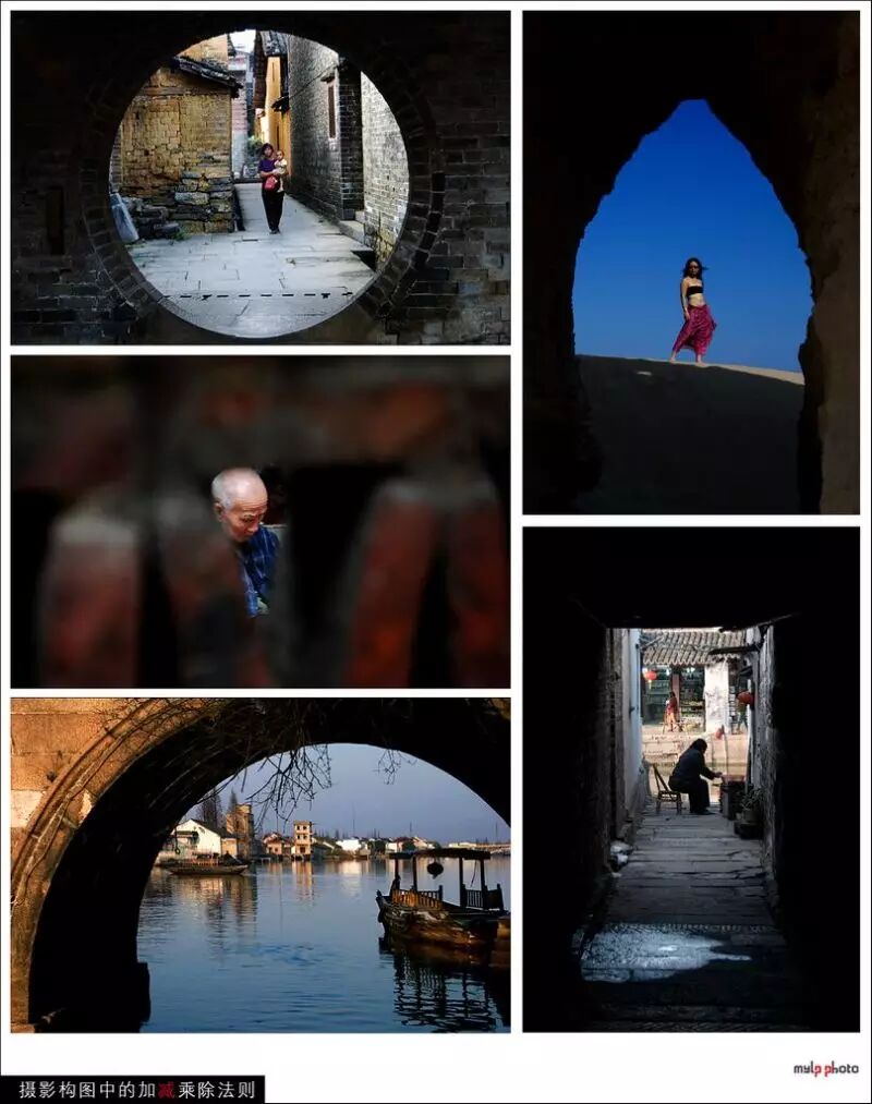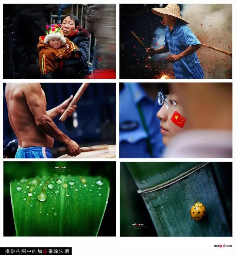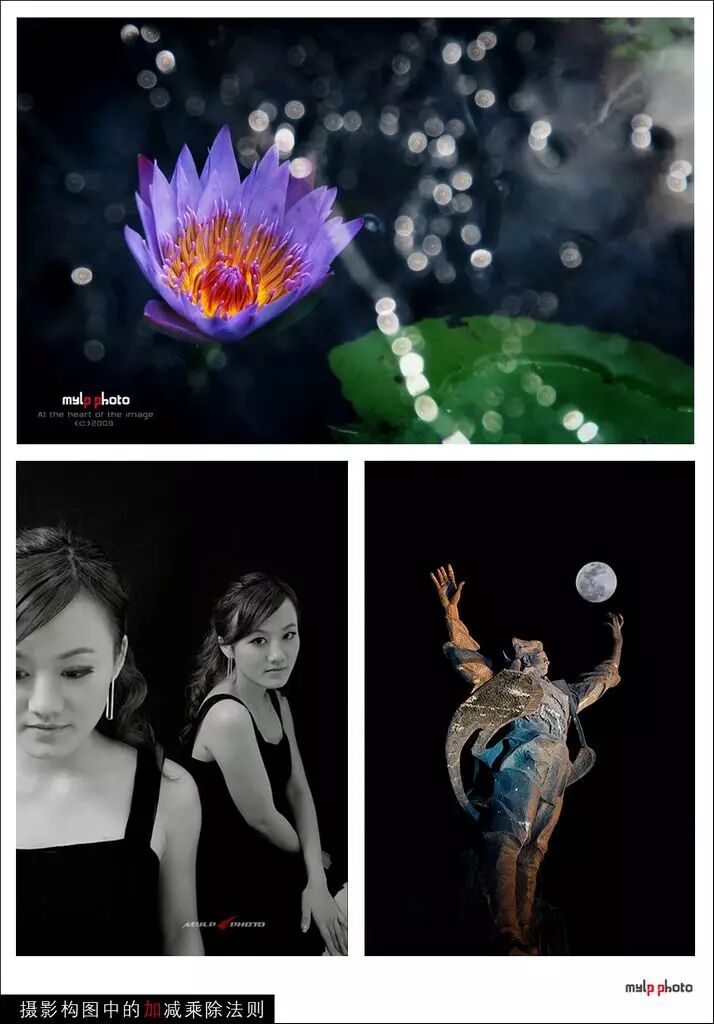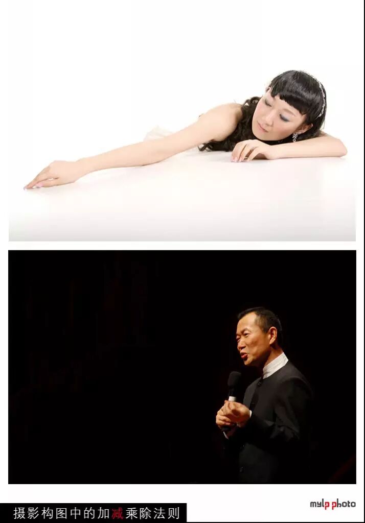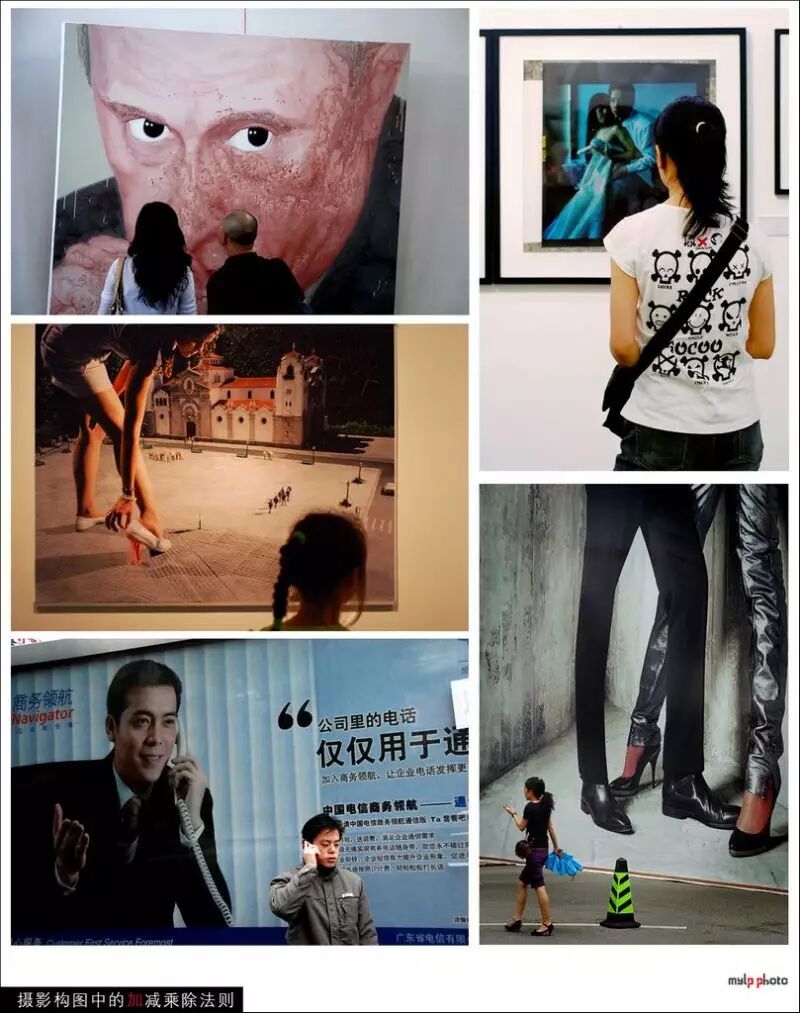 加法的应用很多很多,不能一一列举,不管怎样,务必记住一个重要的原则:要锦上添花,不可画蛇添足!加入的元素 必须为主题的表达服务,一切与主题无关或可有可无的元素,能减则减。因为,摄影总的来说就是一种减法的艺术。 方式,但如果只是不求章法的平常记录,那就不是摄影了。只有精心地提炼和艺术地再现,才是摄影的本质。很多色友 经常会这样说:俺这叫拍照不叫摄影。且不管这两个词的含义是否一样,其实说这话就是对摄影有了我以上所说的观点。 提炼就是减法,在纷繁复杂的现实世界中找到动人的瞬间,并把一切多余的元素减去,留下那最直接最迷人最精华的 部分,这样才能让人赏心悦目。我们平时在交流片子时经常会这样点评:这电线杆大煞风景啊;这个光斑太碍眼了; 把那条黑乎乎的东东去掉嘛;背景乱了点;那个人不在就好了。。。很明显,一张有着严谨构图的作品是不应该出现 让人觉得多余的元素,它应该是主体突出,主题鲜明,干净利落,一剑封喉! 含义和方式的。 简单地没有亮点没有内涵的。大家还记得爱德华·韦斯顿那只著名的甜椒吗?在单调的背景中拍一只甜椒,够简约的吧, 太平常了吧,但它绝对不简单,将一只甜椒硬生生地拍成一个活灵活现的人体,这是何等的功力! 要说到减法,说到意境,其实老外应该向咱中国画学习。大家知道,绘画和摄影是共通的,但不同的是,绘画是一种 加法的艺术,就是在一张白纸上涂鸦,西洋画祟尚写实,中国画注重写意,写意中有个很常见的手法就是——留白。 不要老是把画面堆砌得满满的,留下一些空白,留下一些联想,这也是摄影中追求意境的一种有效的手法。 高调子和低调子作品也往往是简洁的,减去复杂的背景,留下鲜明的主体。很多人物肖像题材中都会应用到。 剪影,估计也是大家很喜欢拍摄的题材。这正是一种不折不扣地减法,不管男女老少高矮胖瘦,不管善良凶恶忠奸美丑, 都会被逆光隐去真实的面目,留下的是美丽的轮廓,动人的瞬间形态。大光比的逆光下拍照,很多元素很容易过曝或 欠曝而被简化,让画面显得简洁,关键的是要捕捉到剪影的动人形态。 画框,也是一种减法,就是利用一些可穿透的前景作为一种特定的画框,将主体放在框内,简化画面,突出主体,还可以增加趣味性。 还有一种比较特殊的手法,就是运用慢门,让占比例小的静的主体实,让占比例大的动的物体虚,这样可以简化复杂的 场景,又可获得特别的视觉,比如拍流动的车灯,热闹的集市等场景;还可以运用追随或变焦手法将主体以外的背景简化。 你想去掉大街上繁杂无章的行人吗?你想去掉马路上来来往往的汽车吗?用慢门“干掉”他们 有一种可以通过后期来实现的特殊手法,就是减去颜色。将某些有视觉亮点的颜色保留,将其余部分颜色去掉,会起到新鲜的视觉效果。 利用一些特殊的天气,比如雾天、雨天、雪天等,通常会简化背景,营造出意境。所以,当遇到这些天气时,别抱怨, 赶紧抓起相机跑出去! 要想画面简洁,与拍摄距离及焦段也有关系。很多人说超广角难控制,其实就是容易摄入过多的元素,让画面杂乱,有时 避无可避那也实在没办法。用长焦可以压缩像场,减少背景干扰。拍特写当然更容易简化画面,一些动人的特写瞬间会 让人赏心悦目。更加极端的是微距,近距离就可以将主体放大,轻易减掉繁乱的背景。 【构图中的乘法】 乘法,是指相同或相近的元素在画面上大面积复制出现,或规则或不规则分布,令画面充满韵律节奏感和视觉冲击。 比较容易刺激眼球。 在构图时,变换角度去拍摄可以获得不同的视觉效果。元素的排列可以是平面的,也可以是斜向或纵向的,这样能产生 强烈的透视感和空间感。 不过,如果只是单纯的元素排列也许会单调一点,缺乏视觉亮点,如果在乘法中运用了加法,为画面增加一个趣味中心,那就更生动有趣了。在美学的平面构成原理中有个名词叫做突变,突变就是在乘法中融入的加法,打破重复与规律,产生对比,增强视觉效果。有两种情况,一种是突变的是不同的元素,一种是同一类元素自身的突变。 对称式构图也是一种乘法,因为它也是同一元素的复制,或左右或上下或斜面呈镜像分布。大家都有共识,一般情况下主体不适宜放在画面中间,普遍认为放在黄金分割点位置会比较舒服(如同三分法构图),但对于对称式构图就不用考虑这个原则,它正好需要从中间开始作对开式构图。呈对称分布的景物,对称式设计的建筑,或利用镜子、水面等反光物都可以运用到对称式构图。如果打算运用这种方式,,让画面元素平均分布,一刀两断,各不相欠! 【构图中的除法】 除法,在这里要说的是关于封闭式及开放式这两种构图观念。大家知道,数学的除法中,有的可以除尽,哪怕是有余数,最终还是除得尽,比如10÷2=5,10÷4=2.5;有的却除不尽,比如10÷3=3.333333……我就用这个法则来比喻构图中的除法,除得尽的指封闭式构图,除不尽的就指开放式构图。 下面的一组,大家看到的都是些“残肢断腿”,传统的观念常常会告诫我们,拍人要拍全,不要随便砍头切脚,但是开放式不管这些,关键看你怎么砍了,哈。。。 有一种情况,画面展现的信息是相对完整的,但由于主体的某些动作或眼神是指向画外的,与画外产生了某种关联,而其动作或眼神的含义在画内没有让人明确的解读,我个人觉得这样可以看成封闭式,可以说是开放式也无妨