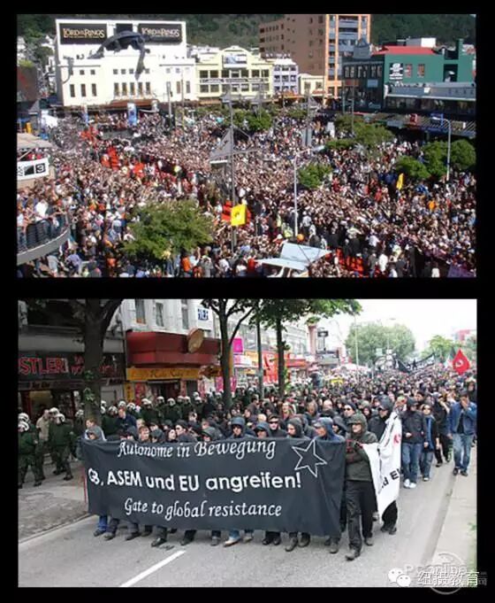 两张照片的主题均为游行。上一张已经作为反面例子出现过,而下面那张虽然素材相同,但截然不同的处理让其看起来舒服很多。首先这张照片“更近”,这使得照片上的元素相比上一张大大减少;其次,整个画面安排更为规律,众多的“人”被安排在了从左下角到右上角的斜线之中,给人以整体感;最后,斜线的构图方式让人的视觉焦点从人们身上“引导”至最前方的“横幅”上,从而让整个画面与横幅上白色的字呼应,凸显了游行这一主题。