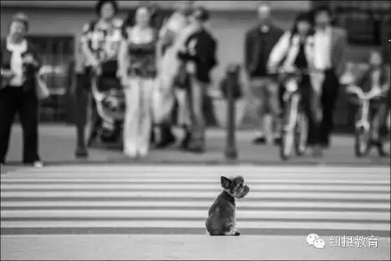 同样的,斑马线上的这只狗也属于“决定性瞬间”。如果拿走这只狗,整个画面就会显得十分单调而没有趣味。所以当有了某个场景具有这样的潜力时,不妨去等待一下主体的出现,很有可能就是一副佳作。