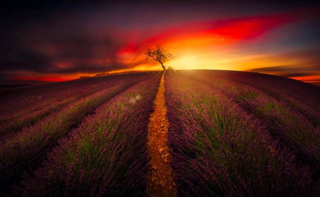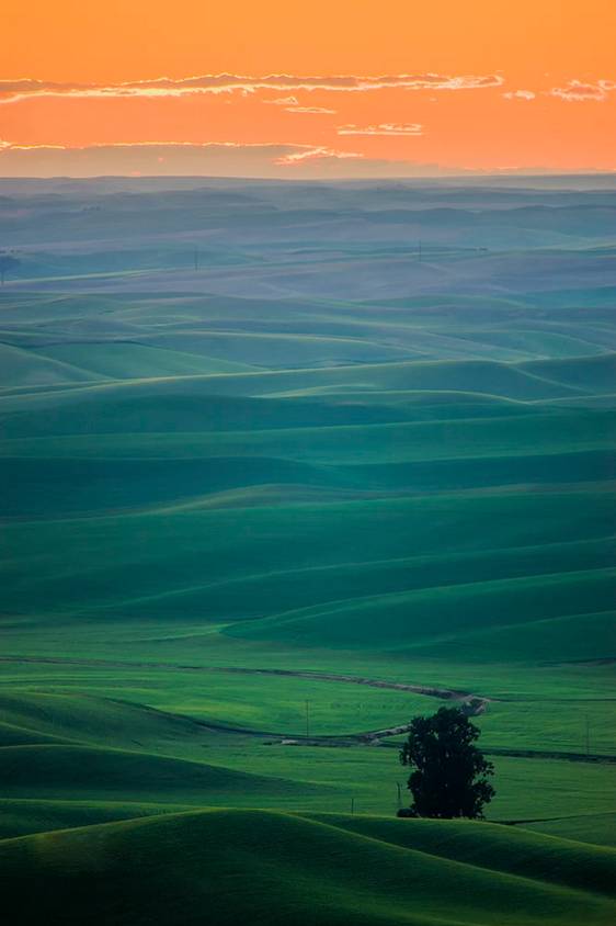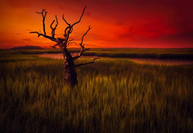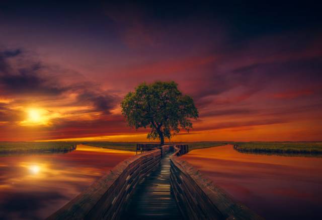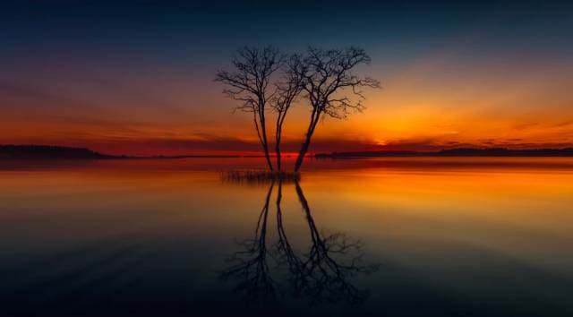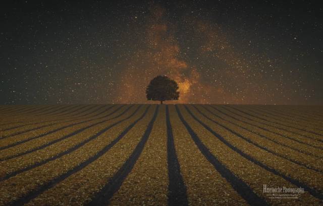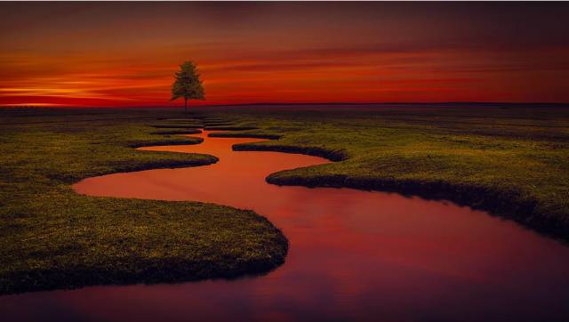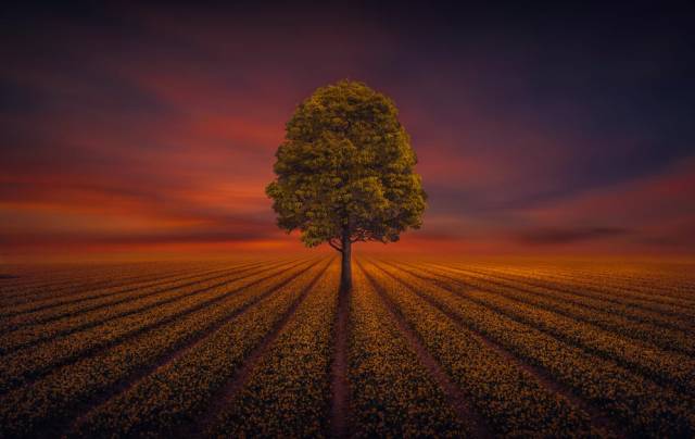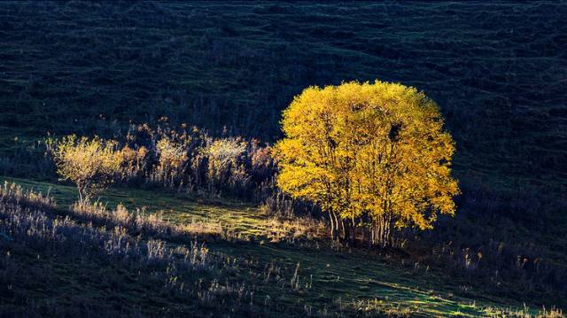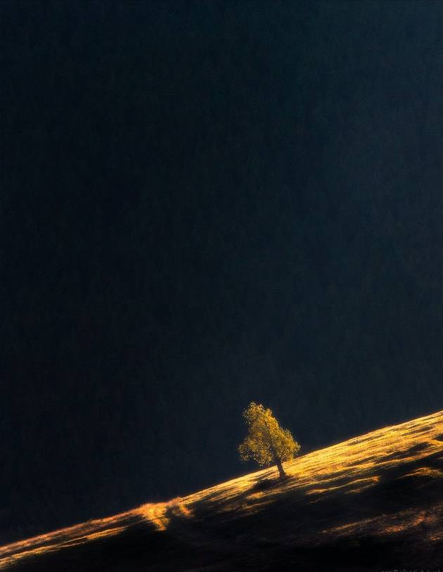 树可以成为很好的构图中心,在于少不在多。一棵树可以传递出更多的情感,反映出大小对比,用对称构图进一步表达简洁、空旷的画面。
