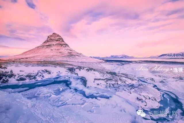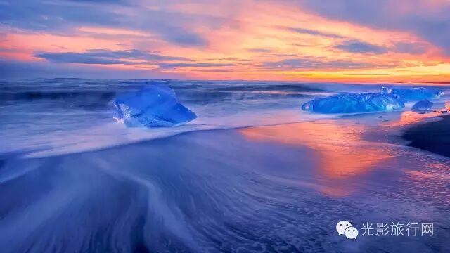 黑沙滩——一个引得无数摄影者尽弯腰的景点。犹如钻石般晶莹的冰块缀满海滩,浪花在黑色的沙滩上恣意涂鸦着各种变幻莫测的图案,但真要拍好这美景却并不容易。当我架设完相机选好视角构图还没来得及按下快门,海浪却在寒风呼啸中翻涌而至,迫使我不得不拿起设备落荒而逃,经过长时间失败的游击战后,本“大湿”下定决心任凭冰冷海水淹没我的裤子靴子,只要相机安全就坚守阵地绝不后撤,终于在彩霞映照沙滩之时拍得这张集:虚实、动静、冷暖各种对比于一身的作品,泡了整个日落的冰海之水能得到这样的作品也值得!