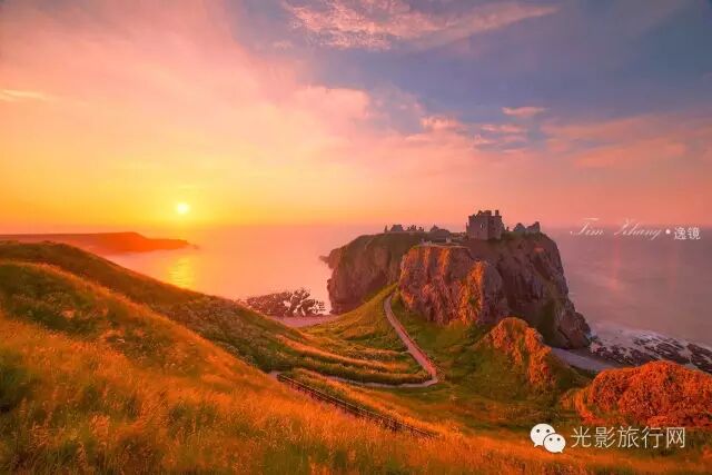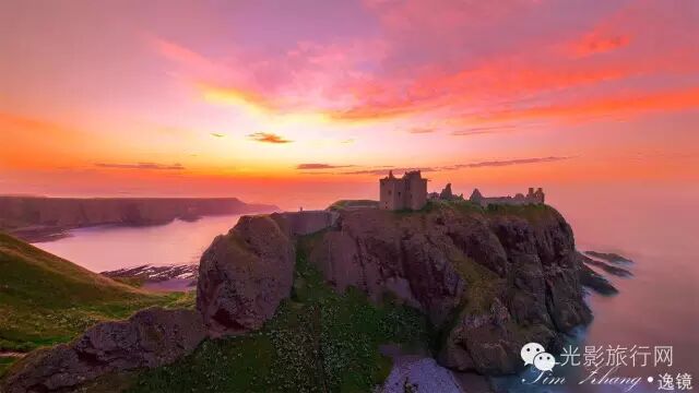 由于纬度偏高苏格兰夏天的日出极早。为了拍摄以下两张作品,我一个人凌晨三点来到大西洋边的海崖之上,静静守候着初升的朝阳,只有这危崖孤堡默默的在海风中陪伴着我一起迎接那灿烂的时刻。