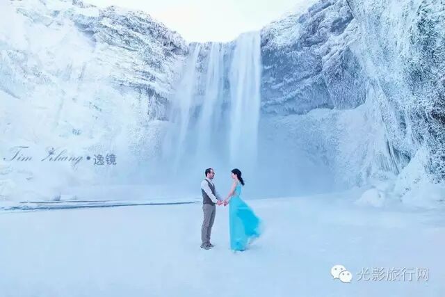 暴风雪后我来到冰封的山体旁看到这梦幻般纯净而壮观的冰雪瀑布,令人更难以置信的是在这冰天雪地中出现了一对新婚燕尔,他们在冰山下盟誓在风雪中亲吻,我相信只有爱的力量方能驱走严寒融化坚冰温暖他们的心灵。