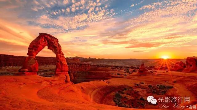 傍晚当我找好拍摄点时,这对恋人正打算赶在日落前下山,我告诉他们今晚的日落将会极其绚烂非常难得,希望他们不要错过。他们留下了,当日落的光辉洒向大地、拱门、云端时,这对恋人被眼前辉煌景象给深深震撼了。