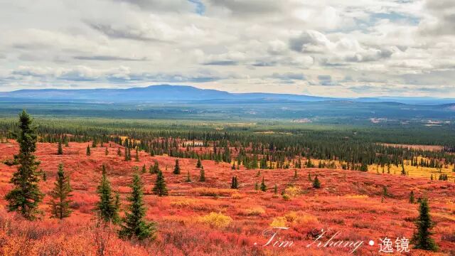 秋天的阿拉斯加有着大地调色板的美誉,漫山遍野被冻红的蓝莓树叶中点缀着黄色的胡杨绿色的松树,大大小小的湖泊星罗棋布在原野之中,冰川河绕着雪山蜿蜒流淌,野生动物散落其中,有熊、鹿、山羊、狼、麋鹿等等,在雨雾朦胧中构成了一幅幅如梦如幻的水墨丹青,在半晴半雨中形成一幅幅绚丽的水彩画卷。