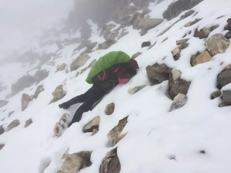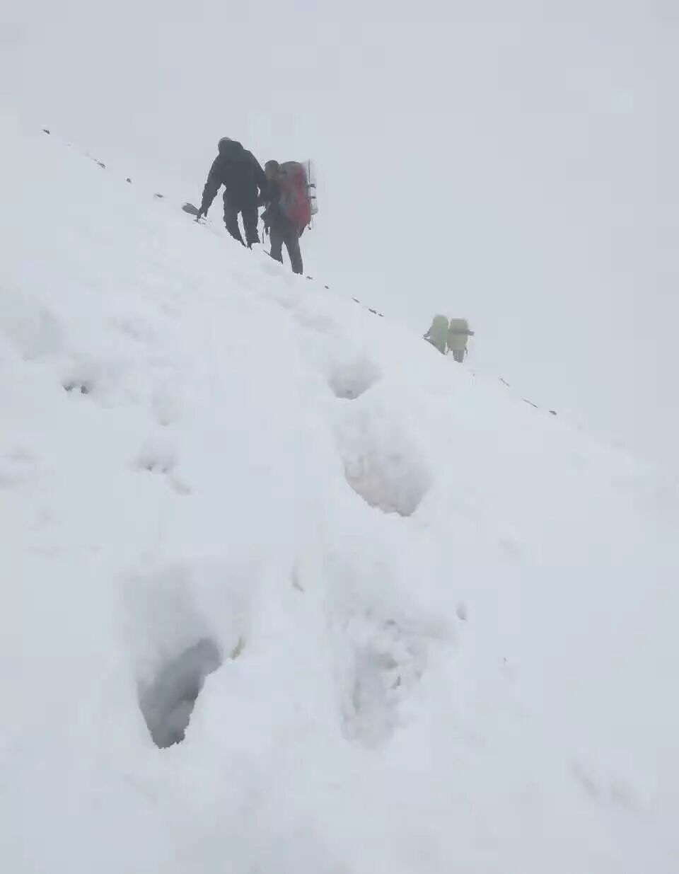 差不多正午时分,我们终于抵达红海子垭口,原计划走望郎包的我们,由于雪积太厚不得不改变路线,前面依旧是白茫茫一片,能见度只有十米,非常危险。