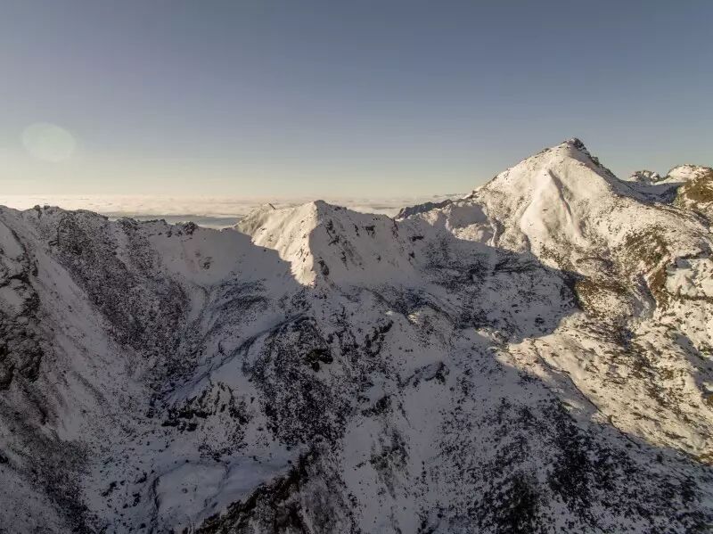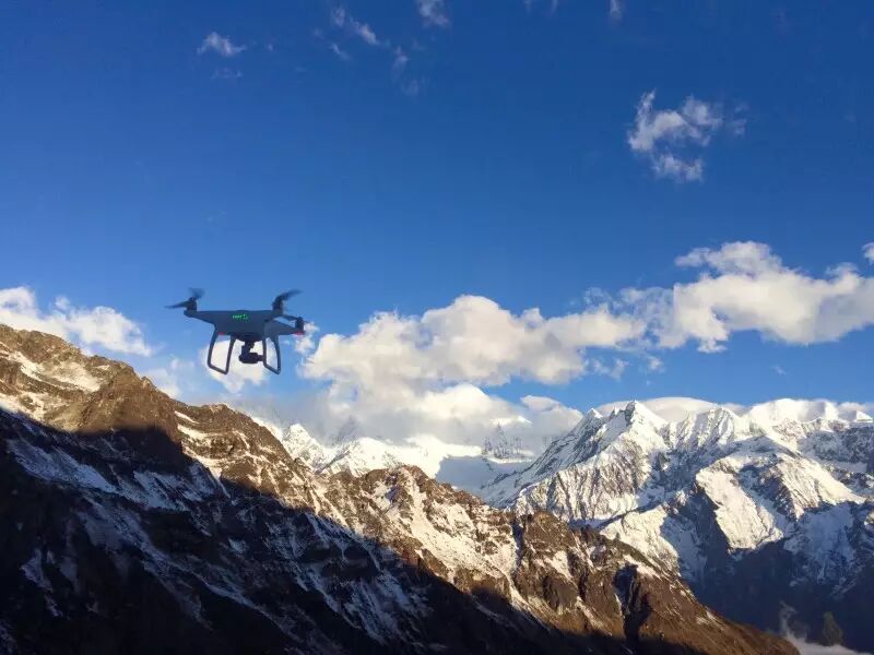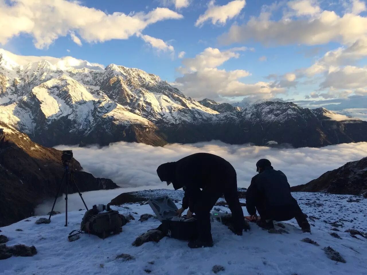 航拍的时候我们看到了上图的雪山,前一天我们就是从两个雪山尖中间那个垭口下来的,现在回望过去确实有点惊险。上山四天,除开每天上午十点以前能看到一点蓝天外,基本上都是被白雾笼罩,在这样的天气里,看到的雪山的刹那,心都被融化了,一路的艰苦都值了。