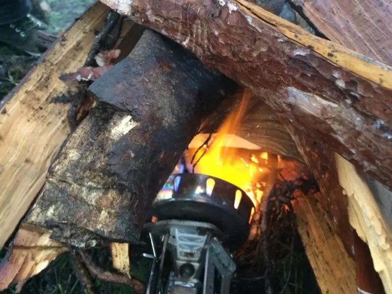 幸运的我们在不远处找到了一捆湿柴,游侠用之前在年保玉则烧火的方法,用气罐来点燃湿柴,这是一个极其缓慢的过程。此时天上还飘着小雨,小编只惦记着什么时候能把鞋垫烤干呀。