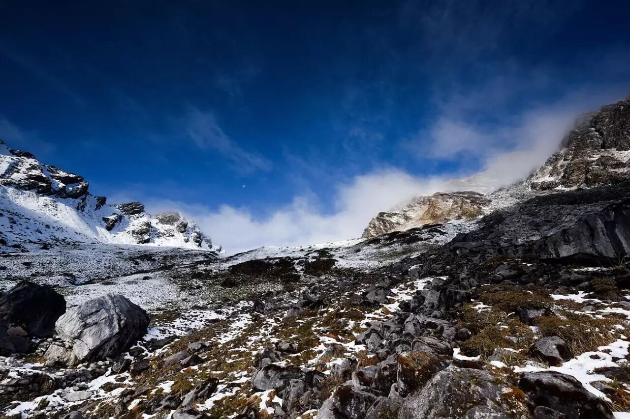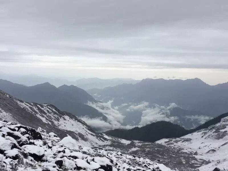 我们跋涉了十一个小时,从起点海拔1800米直线上升到3870米的小沟营地,山下的雨变成了山上的雪。向导说,天气好的话,从鸡心梁子望下去非常漂亮,此时满山杜鹃花正开,我们没有眼福,可惜了可惜了。