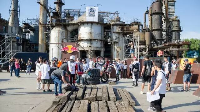 本次红牛摩托攀爬锦标赛的场地和障碍布置也极具特色,以高炉、管道等大型工业设备为背景并以油桶、枕木、轮胎、车辆等设置障碍,工业感十足,也为全景画面营造了独特的视觉效果。