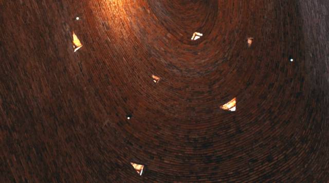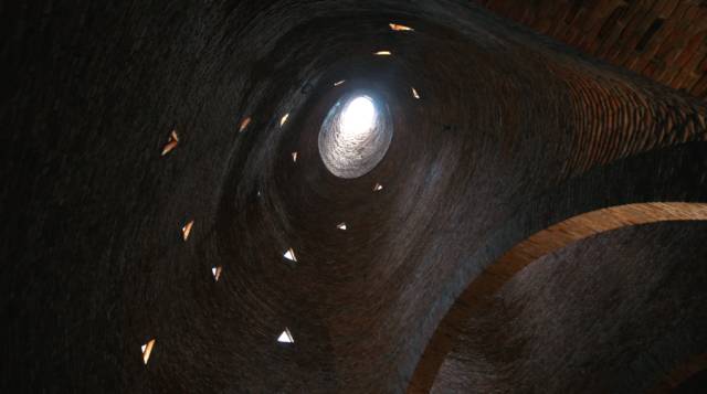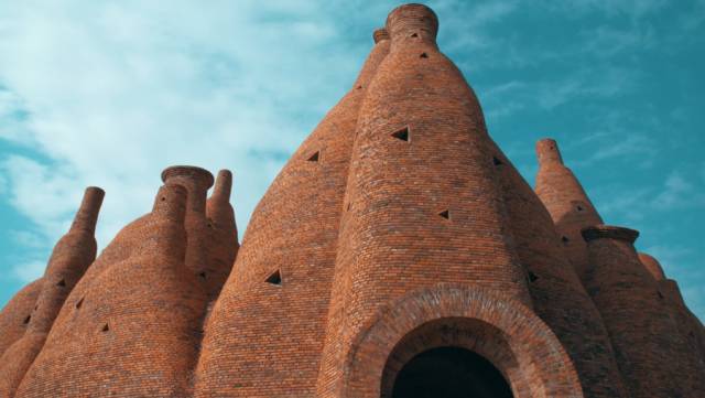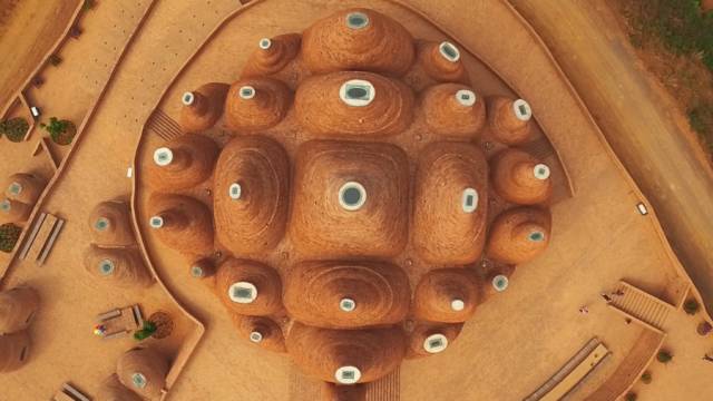 一个由20多个大大小小的、倒过来的万花筒组合的巨大建筑。