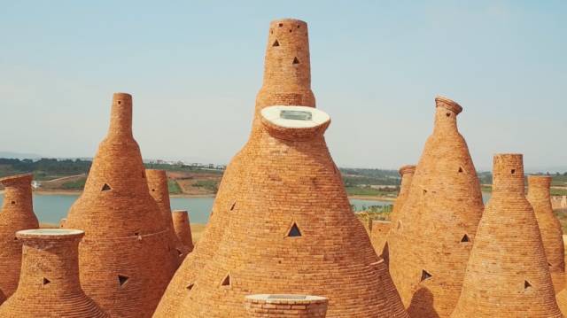 因为在这种红土地上、黄土地上造这种颜色的建筑很匹配,而且它周围的景观也很好。你们仔细看现在的地形,它是缓坡形的,很柔软的地形。远处有很高很高的青山,这种环境是做这种建筑,做这种颜色的调性兼容,是很理想的地方。