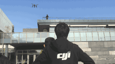 在这次拍摄中,利用主从机互联这一优势,我们的飞手站在一楼,从更广的视角来操控无人机运动,云台手则站在三楼,从更贴近演员的地点遥控云台,两人相距约50米,轻松达成了配合。