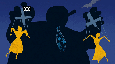 之后,她们变成仿佛在互相掐架的木偶(这里你可以分辨出谁是谁,她们有明显的发型特征),镜头往上扬,大制片人是操控这提线木偶的幕后黑手,这里颇有《教父》海报(木偶图腾)的意味。制片人领带上的树叶图案变成落叶,背景色也由蓝变红,叶子枯黄,代表了人到中年和黄金时代的衰落。