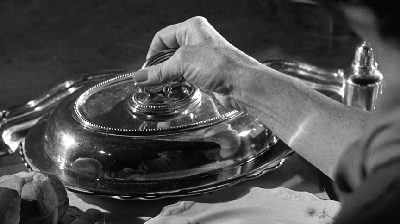 接下来的动作是还原《兰闺惊变》中简给姐姐送餐一场戏,盘中餐是一只死老鼠。从这儿开始,索尔·巴斯视觉元素开始轮番轰炸,伸出的手是《金臂人》(The Man with the Golden Arm,1955)的经典图腾,拿盘子的动作参考了《疯狂世界》(It's a Mad Mad Mad Mad World,1963)出片名的样式,之后的漩涡状又出自《迷魂记》(Vertigo,1958)的经典海报,它们都是索尔·巴斯的招牌设计: