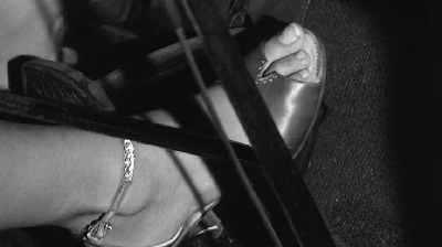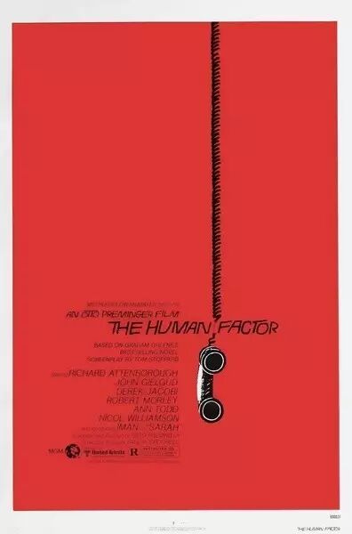 之后是顶拍机位下姐姐坐轮子抓狂的画面,设计师特别夸大了她的影子,这影子更像是被捆绑得手足无措,映出内心的焦躁。之后是她要试图越下楼梯打电话求助,却被妹妹发现的情节。而坠落的电话听筒图腾出自索尔·巴斯的《人为因素》(The Human Factor,1979):