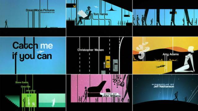 剧集背景置于上世纪60年代,所以片头特地用了那个时代的风格。这种做法很普遍,如同样发生在上世纪60年代的电影《猫鼠游戏》(Catch Me If You Can,2002),片头设计师奥利维尔·赛尔和弗洛伦撒·迪加丝就仿照了老版《粉红豹》(The Pink Panther)系列和索尔·巴斯片头的混搭,就连约翰·威廉姆斯的配乐都是参考了《粉红豹》配乐人亨利.曼奇尼的曲风。我之前在围脖上分享过,他们最初还用到了来做概念图纸:
