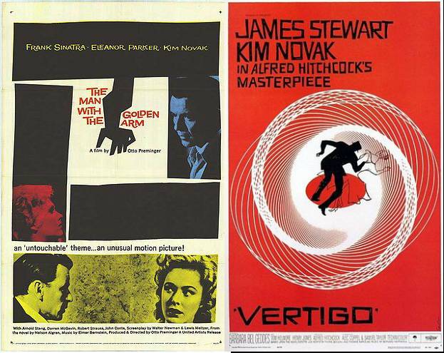 《金臂人》和《迷魂记》的海报,「手」和「漩涡」图腾