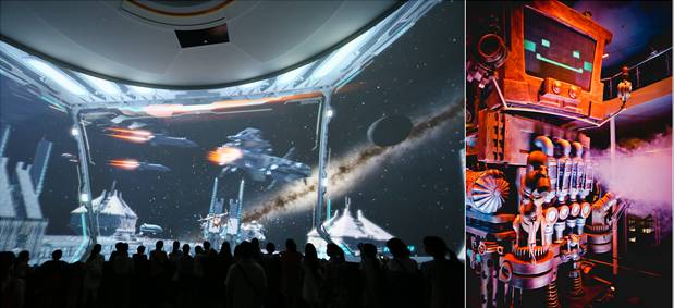 银河系突然发生爆炸,巨大的火球照亮了整个场馆,未来飞行器从宇宙深处缓缓驶来,精彩画面让人直呼过瘾~