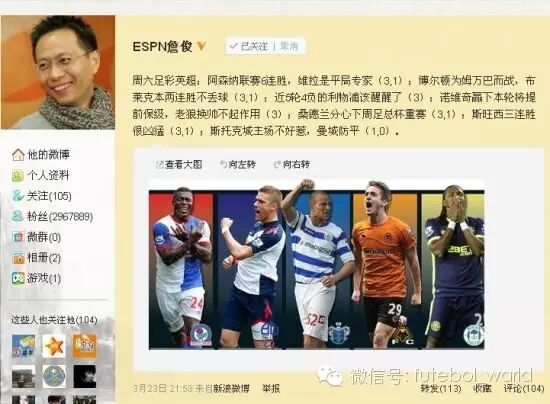在中国国内球迷圈,ESPN的詹俊名声渐起。看球前扫一眼直播链接,常常看到括号里有“詹俊解说”四个字——詹俊已经是直播频道吸引球迷的招牌。在体育论坛里,比赛前也常看到“求詹俊解说链接”的帖子。