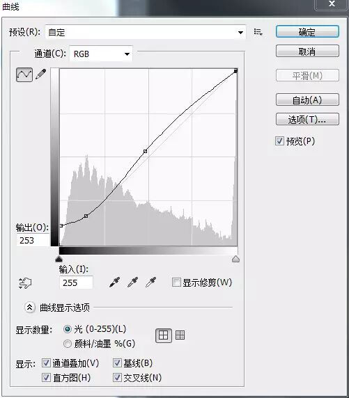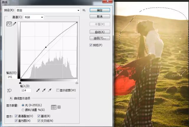 用羽化为200的套索把面部和右上角的区域圈出来,曲线拉亮,突出面部光线。
