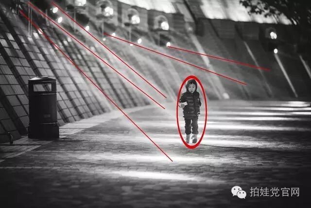 下图这张照片看起来会不会更加立体?这是构图中线条应用创造出来深度感觉。汇聚线在无限远处相交,本应等长的平行线在视觉上渐渐变短,间距也变小。这些线条创造距离和空间的感觉,我将这些线条标记出来,这样我们可以看到它在其中的作用: