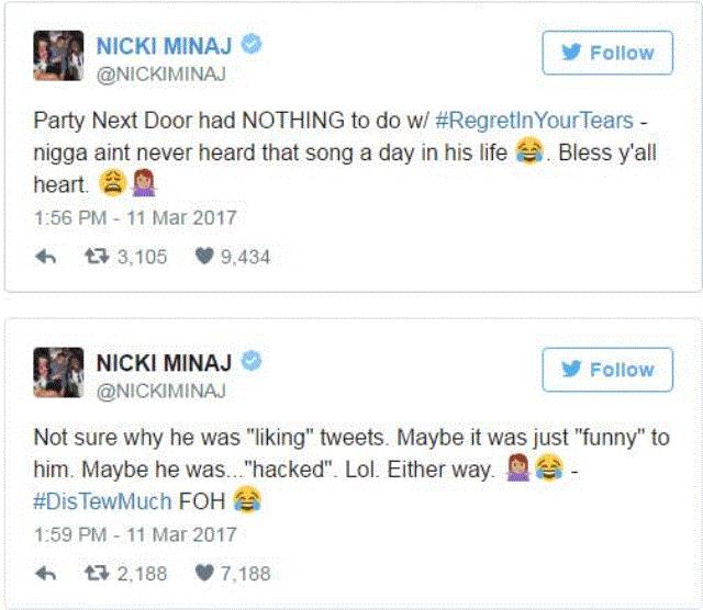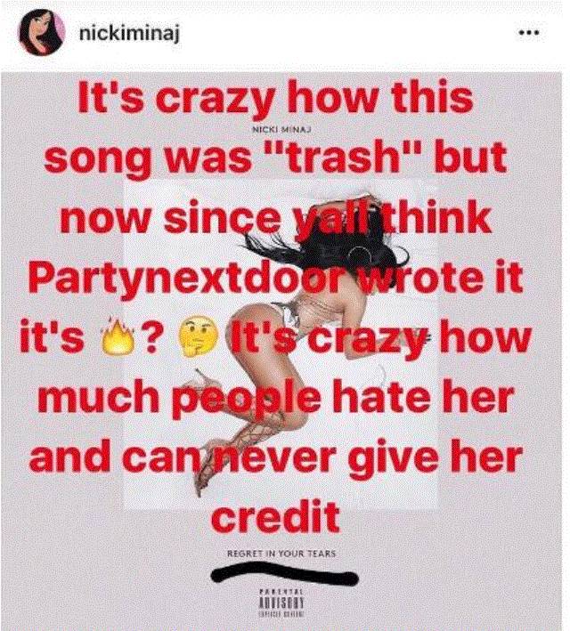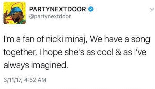 刚刚发表三首新单的Nicki Minaj又陷入代笔疑云,据悉《Regret In Your Tears》这首歌就有OVO成员PARTYNEXTDOOR的“深度参与”,不过这种说法很快得到了麻辣鸡的愤怒回击;PND也发推表示,自己是对方的粉丝,并且希望麻辣鸡可以冷静的面对质疑。