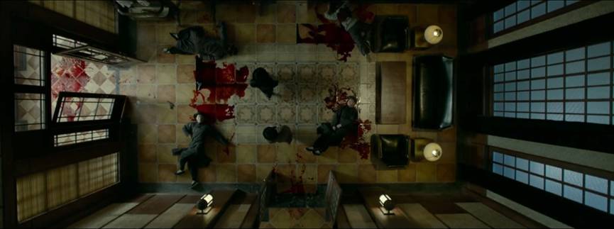 那场戏是一个很戏剧化的场景,尸横遍野,演员从房间里穿过。我想把环境拍得全一点,人在四周高高的墙壁的衬托下显得很渺小,从俯拍的角度看会有一种宿命的感觉。其实这种房子在现实生活中是不可能存在的,更不会有那样的大厅。我们的景一共两层,有10米高,当时还专门调了一个12mm广角镜头来拍这个画面。我们觉得俯拍这场戏会比较有意思,所以我们在屋顶用铝管做了一个很长的轨道,机械组的人在下面看着监视器并根据演员走动的速度拉动威亚来移动摄影机。此外摄影机还要跟着演员上楼梯,所以也用了Scorpio的遥控头,无线跟焦用的是ARRI WCU-4,配上ARRI的超声波测距仪。那场戏准备了三四天,确实花费了比较多的心思,好在效果还不错。