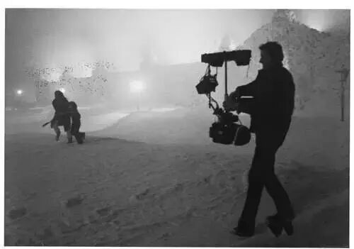 当然,里面标出了许多摄影机的运动,但是并没有特别提到斯坦尼康。只写到摄影机应当移动,或者用轨道。也许斯坦利在早期想到过我,但是以他预计的移动速度,楼梯并不足够平滑,轨道无法放在铺在楼梯上。起初我以为需要拍摄的是某些高潮段落比较疯狂的镜头,但是后来发现几乎所有的移动镜头都要我来拍摄,因为斯坦尼康的运动带有那么一点超现实的感觉。传统的轨道移动镜头一次是出现在外景,与旅馆方向平行,谢莉杜瓦尔(Shelly Duvall)跑开检查雪地车。另一次摄影机从走廊进入舞厅,墙壁可以遮住一些轨道。就只有这两个镜头铺了轨,其他都是用斯坦尼康拍摄的。