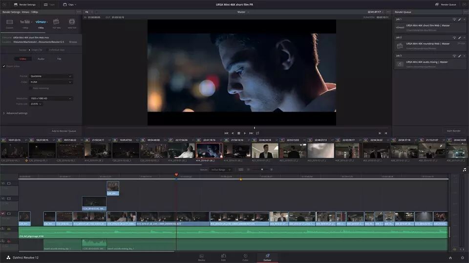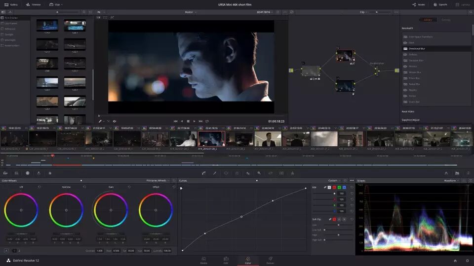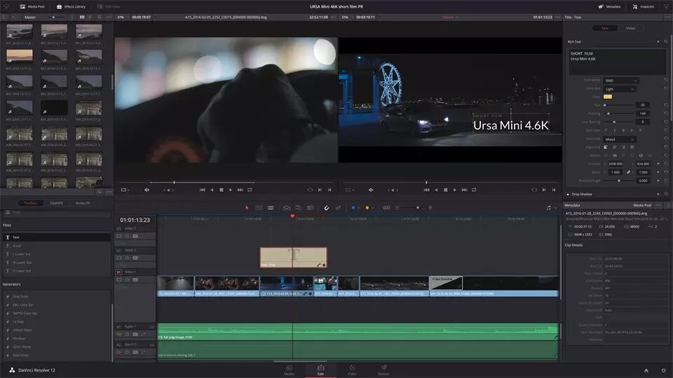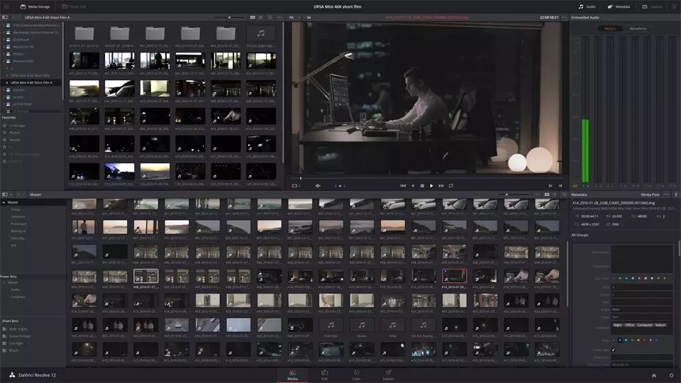 这款摄影机附赠DaVinci Resolve Studio软件,为用户提供了一个完整的后期制作解决方案。这款强大的软件将专业的非线性视频剪辑功能和业界首屈一指的调色工具结合起来,一个系统就能处理URSA Mini Pro素材的剪辑、调色、精编和交付在内的全套流程。DaVinci Resolve Studio能直接处理来自这款摄影机的RAW和ProRes文件,用户无需文件转换就能开始后期制作。因为它采用真正无损处理流程,所有信息都能被完整保留下来。使用DaVinci Resolve Studio是处理URSA Mini Pro素材最快和最高质量的方式。