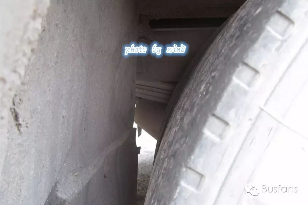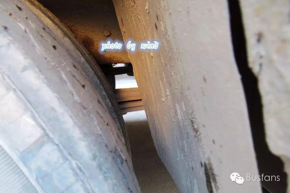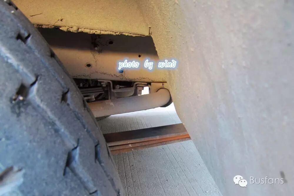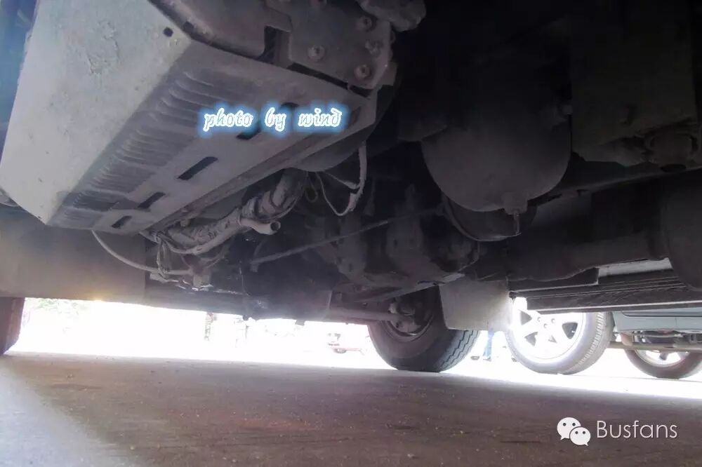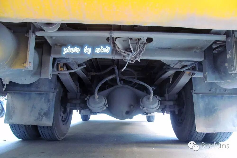头先讲过,呢款车係采用气压制动系统嘅,但係呢批车却有一个好奇怪嘅地方。可以睇到,呢款车嘅后桥居然采用同前桥一样嘅单腔制动气室,由于呢款车冇采用一般嘅双腔制动气室,后桥自然就丧失咗俗称手刹嘅驻车功能。咁一部车肯定要有手刹啦,解决方案係乜嘢?解决方案就係同采用油路制动系统嘅GZ6590V一样,喺传动轴上面装一个用钢丝控制嘅驻车制动鼓,呢个设计真係够晒奇葩。
