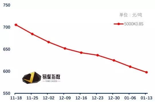 本期(1月7日-1月13日)易煤长江口动力煤价格指数(YRSPI)5000K0.8S即期平仓价格指数为597.70元/吨,环比下跌12.80元/吨,跌幅较上期有所收窄,为2.10%。