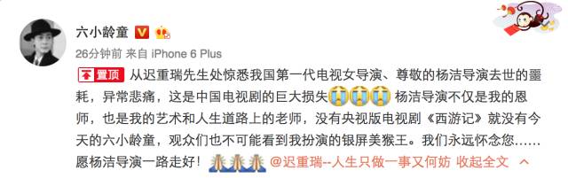 这是一个晴天霹雳,就在昨日,六小龄童的微博发布了一条消息,说《西游记》导演杨洁去世。