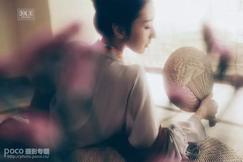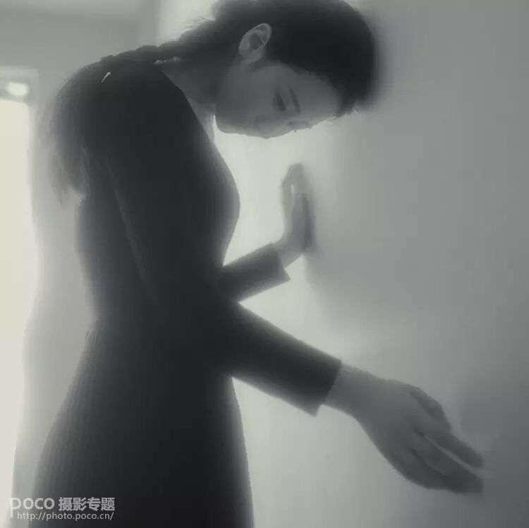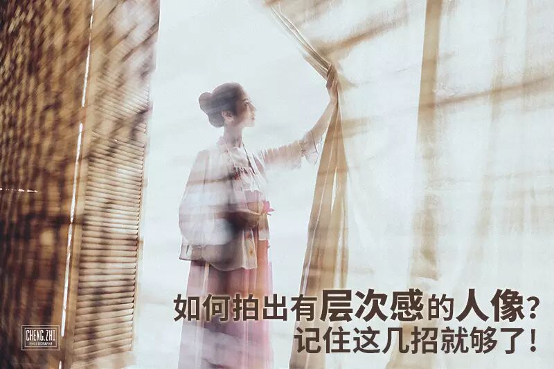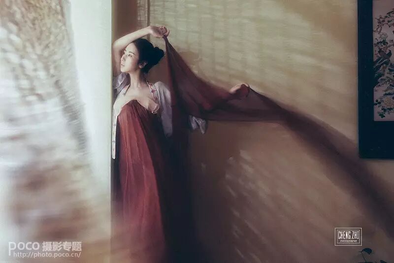 例1:这张用了三脚架,让模特靠墙尽量稳住,在帘子外放上一个风扇对着帘子和人吹,0.6S的慢门,拍了3张,成功一张。