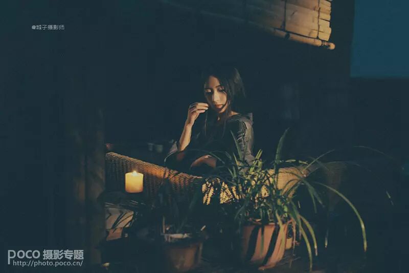 例1:下面这张照片用了一盏小功率的电影灯和一盏LED灯,电影灯从右侧给模特、顶上的垂帘和前景的兰花补光,顺带在左侧的柱子上留下兰花的疏影,LED灯藏在柱子后面给模特的另一边脸颊补点光,为了使光影表现得更合理,我特意在同一侧放了一根蜡烛。