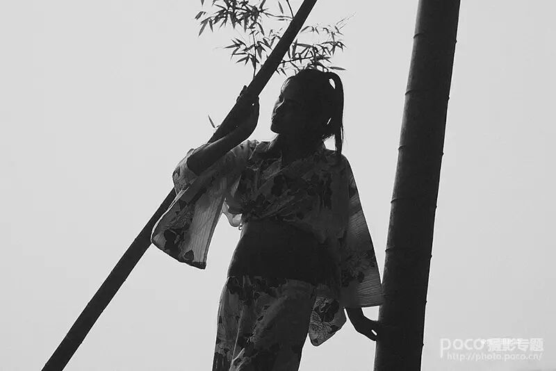 例1:拍摄下面这张照片时太阳躲到云层里了,我把妹子拉到竹林的边缘拍了这张剪影,虽然没有太阳光直射,但竹林里的弱光与竹林外的明亮,在林子的边缘一样形成很强烈的明暗对比,有明暗对比就是光影,而且竹林外的背景是干净的天空,很赞的一个逆光机位。