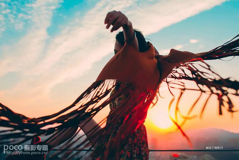 例3:下面这张照片就是前面提到的近距离拍摄,天台上没有太多可以拿来当前景的物件,现场风很大,月师外披上的流苏随风飘动,靠近流苏连拍,OK!月师的表现力加上远景的夕阳晚霞,我很满意!