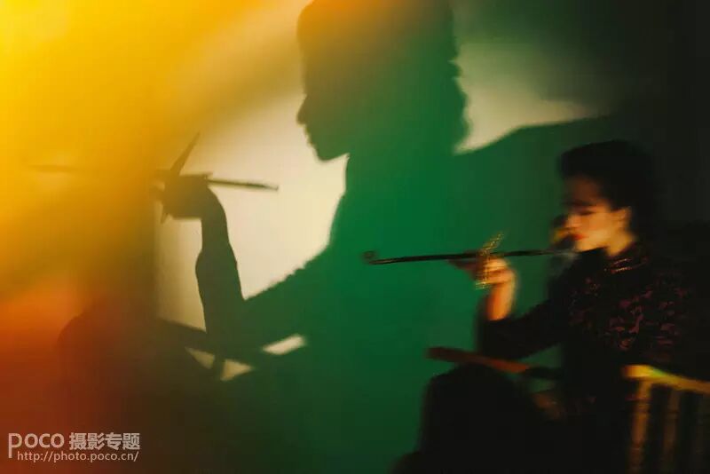 例:下面这张照片用了两盏灯分别贴上黄绿两色滤色片,黄灯给人补光并在墙面上打出影子,绿灯给暗部补光。最后拍出来就有了冷暖对比的效果。