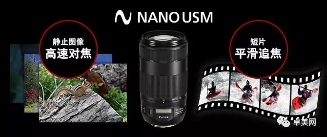 镜头的对焦驱动采用了NANO USM超声波马达。这是一种佳能新开发的超声波马达,呈芯片状,体积只有人的指甲盖大。别看它体积很小,性能可谓集环形USM超声波马达与导螺杆型STM步进马达优点于一身,同时具备高速对焦与对焦安静顺畅的特点,还支持全时手动对焦。