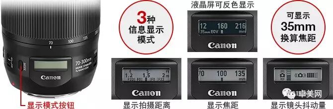 镜头采用了液晶屏取代了镜头上传统的距离视窗,除可以显示与传统距离视窗相同的拍摄距离信息外,更可在搭配APS-H画幅或APS-C画幅相机使用时,显示35mm换算焦距,有助于用户把握拍摄视角。不仅如此,液晶屏还可以显示镜头当前的焦距信息以及镜头发生抖动时的抖动量。此外,液晶屏还可以反色显示,在夜间等昏暗场景下,具有更好的可视性。不同显示模式的切换均通过液晶屏左侧的显示模式按钮进行,短按(1秒以内)可循环切换液晶屏的显示内容,按压超过1秒(2秒以内)可切换反色显示,而按压2秒以上则可开启或关闭液晶屏显示。