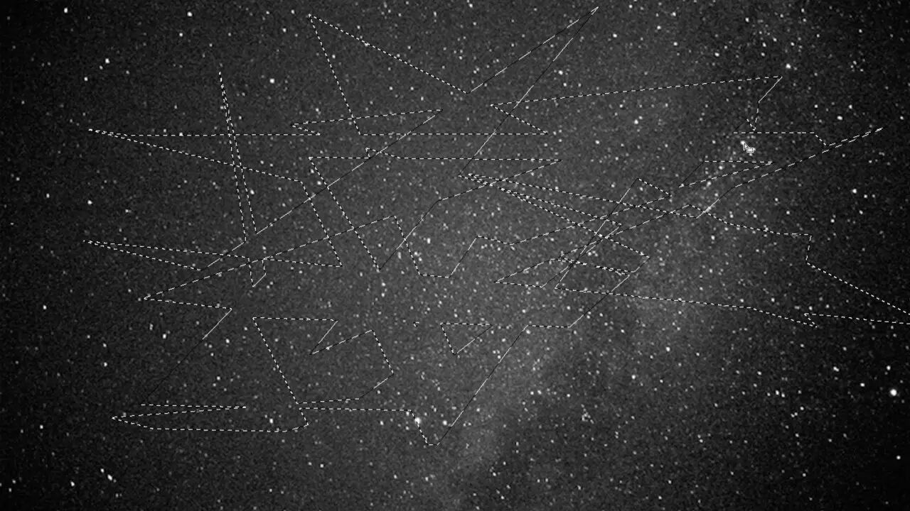 星际旅行系列的电视和动画对艺术家林科影响很大,他对很多科幻的想象都是来源于这些影视的阅读。他用Photoshop的连线工具,在星空图片上的星星间连线,这个操作在我看来就是飞船在宇宙间的旅行。
