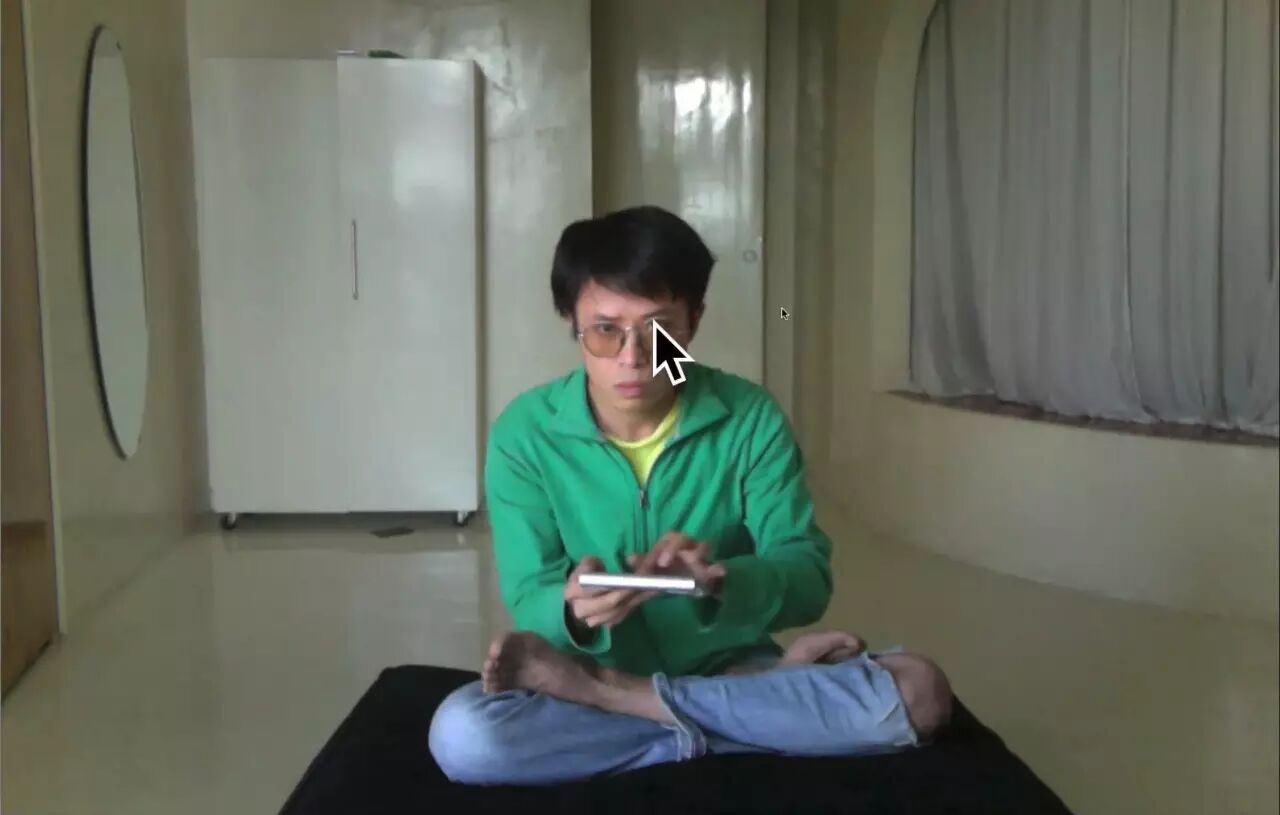 “当我的全身进入电脑摄像头的范围里,我盘腿而坐,远距离操控电脑。我可以和自己身边的这个鼠标光标做一个互动的表演。它看起来像一个苍蝇,但我的动作有点像做刀削面的机器人。”