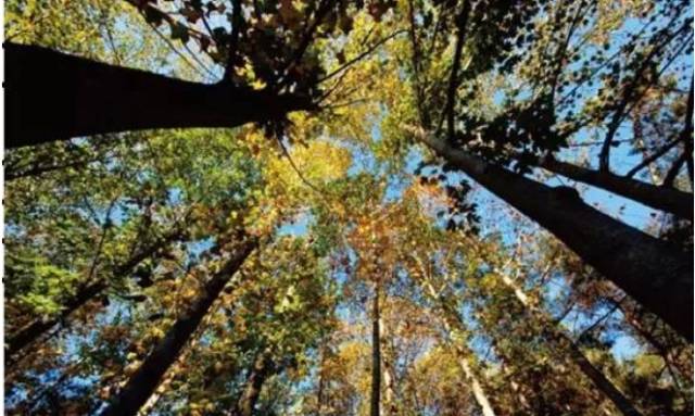 利用广角镜头,向上仰望天空,拍摄了呈放射状茂密生长的树林