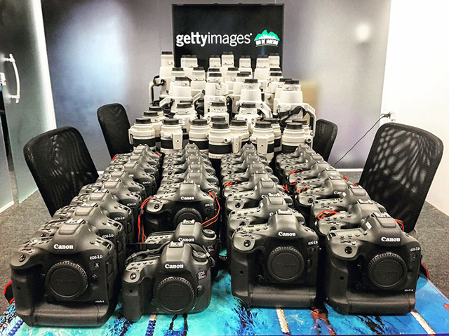 整个装备库全部由佳能顶级摄影器材组成,每个摄影师都会配备一个重量为50磅的相机包,内含四部单反相机、一只16-35mm f/2.8镜头、一只24-70mm