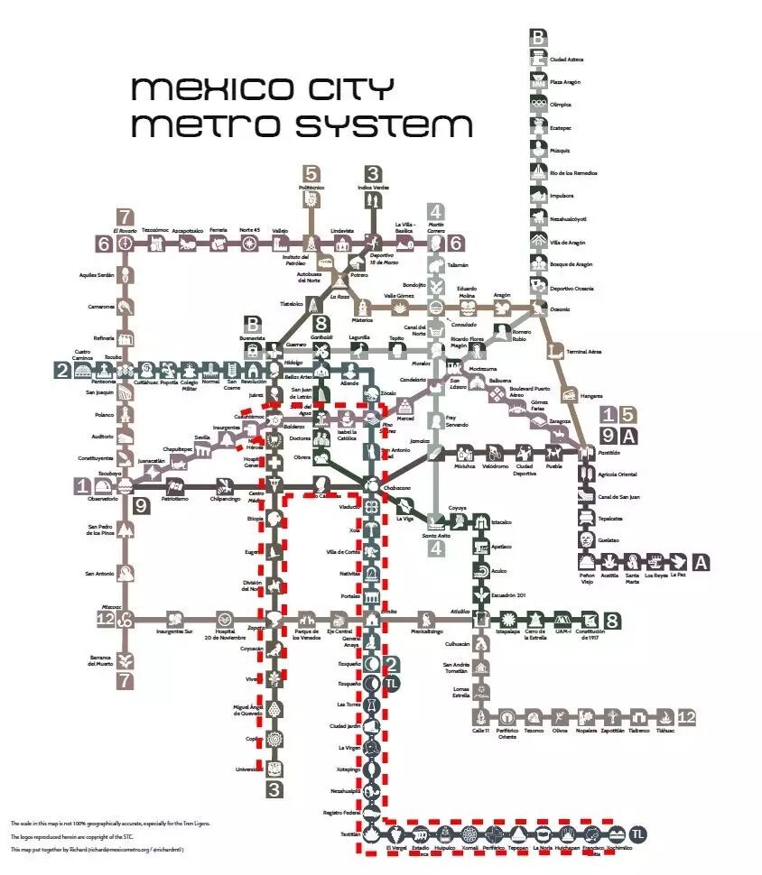 看下图的墨西哥城地铁系统,复杂程度不亚于魔都。