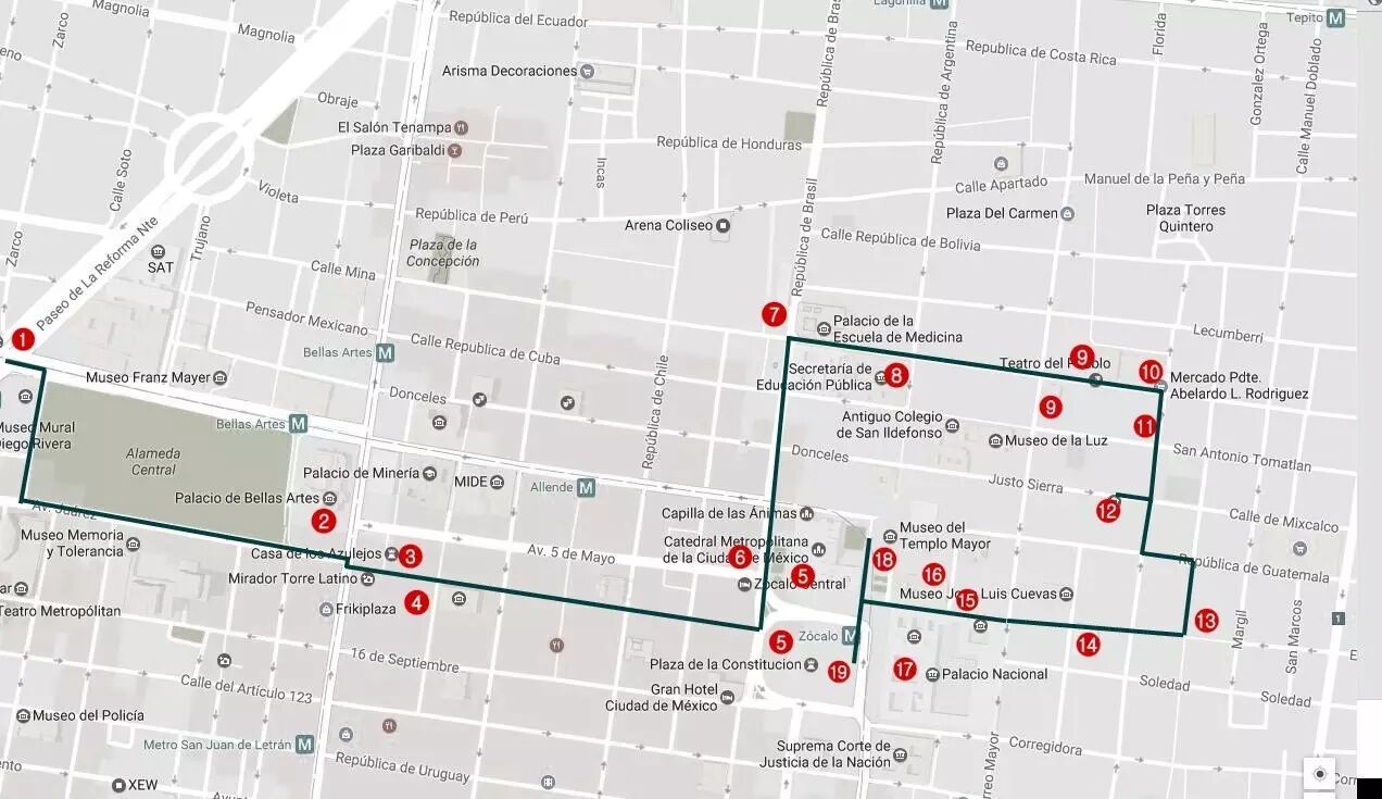 线路:改革大道 (Paseo de la Reforma)- 艺术宫(Palacio De Bellas Artes) - 瓷宫和里面奢华的饭店 (Casa de los Azulejos)- 弗朗西斯圣殿(Iglesia de San Felipe de Jesus) - 宪法广场(Zocalo)和首都大教堂 (Ciudad de Mexico)- 国家当铺(Nacional Monte de Piedad) - 广场 (Plaza Santo Domingo) - 教育秘书处 (Secretaria de Educacion)- 古建筑 (Museo de las Constituciones)和 剧院(Teareo del Pueblo) - Mercado Abelardo Rodriguez - 教堂 ( Iglesia de Nuestra Senora de Loreto) - 犹太教会堂(Sinagoga Justo Sierra) - 巴洛克建筑(Templo de la Santisima Trinidad) - Academia de San Carlos - 拉丁美洲第一个印钞机 - 财政博物馆(Museo de la Secretaia de Hacienda y Credito Publico)- 国家宫殿(Palacio Nacional) - 大广场神庙(Templo Mayor Museum)