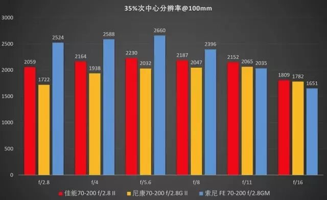 100mm焦距相对于70mm焦距画质变化不大,比较大的一点区别就是索尼70200GM的像场均匀性开始反超佳能70200IS,从中心到常用的构图三分点均能领先一定程度的解析力。70200GM的中心画质最佳光圈依然是f/4,靠边缘一点的话则需要f/5.6才能达到最佳水平。70200IS则是中心画质最佳光圈f/5.6,边缘最佳光圈f/8,看来拿小白兔拍风光的人这么选择也不是木有道理呀~至于尼康70-200VR,最佳光圈散布在f/5.6~f/11,不太稳定。这支镜头确实在现在新品的对比下,也到了该更新的年纪了。